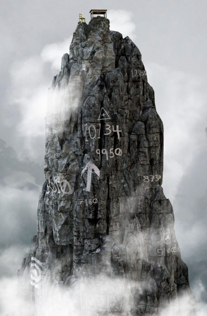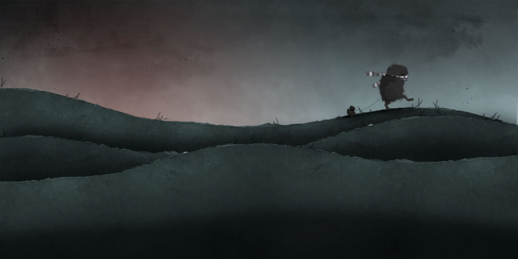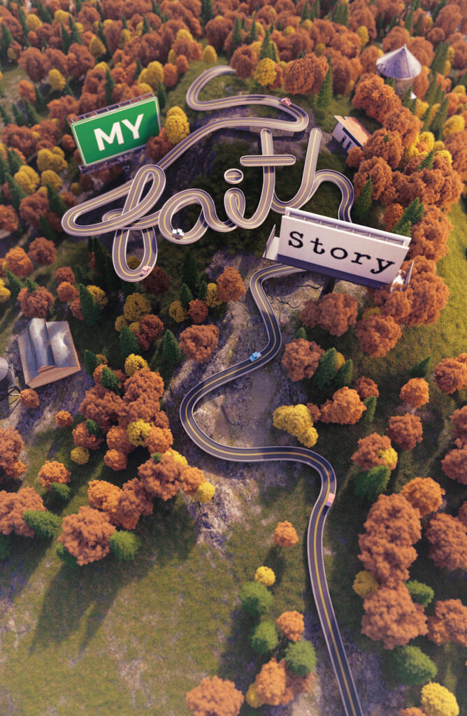 The idea was to spell out the title with a road winding through the landscape, but the more it looked like a continuously flowing road, the less it looked like text and vice versa. Earlier versions with the full title interpreted as the road were simplified to just being the word "faith", with other text added as a road sign and billboard.